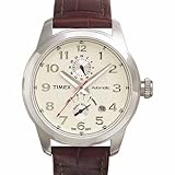This Timex men's watch doesn't require a battery or winding; it stores energy every time you move your wrist. It has a brown, genuine leather band attached to a stainless steel case. The bezel is round and the cream-colored dial is easy to read with Arabic-numeral indexes. There is a date window between the four o'clock and five o'clock positions. Two gauges on the dial indicate 24-hour time and the power reserve. The watch features a quartz movement, has a mineral crystal, and is water resistant to 165 feet (50 meters). It is covered by the manufacturer's 1-year warranty. Read more