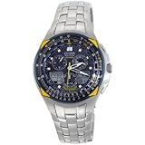 Give a special gift to that special man with an eye on the sky with the Citizen Blue Angels JR3080-51L stainless steel watch that honors the Blue Angels, the legendary US Navy precision flying team, with an official Blue Angels insignia on the caseback. It's powered by Citizen's unique Eco-Drive, which absorbs sunlight and any artificial light through the crystal and dial to recharge the watch continuously. The fast-forward timekeeping features include time and calendar in twenty-two time zones, thirty cities, three world time alarms, a 99-minute countdown timer, one-touch interchangeable analog/digital time, and 1/100-second chronograph that measures up to 24 hours. The large round navy-blue bezel offers a bi-directional rotating slide rule with yellow triangle accents. The stainless steel bracelet band is composed of brushed and polished links. The navy blue dial background features large silver-tone hands and Arabic numerals. It also features water resistance to 100 meters (330 feet) and a scratch-resistant, non-reflective mineral crystal. Read more