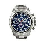 Diving watch, Quartz movement, Chronograph featuring 30-minute, 1/20-second and continuous seconds subdials, Polished silver-tone sword hands with luminous accents and red chronograph sweep seconds, Polished red hands mark subdials, Applied luminescent polished silver-tone baton/dot hour markers, White Arabic numbers and indices mark subdials and surrounding tachymeter scale, INDIGLO® night-light, Magnified analog date aperture at four o'clock, Navy blue dial with textured wave pattern and polished silver-tone logo applique at twelve o'clock, Brushed silver-tone stainless steel bracelet with adjustable links and push-button-clasp, Unidirectional brushed silver-tone stainless steel bezel with black top ring, luminescent triangle markers, silver-tone Arabic numbers/indices and engraved black Arabic numbers, Chunky brushed silver-tone stainless steel round case, Stainless steel screw-down caseback, Mineral crystal, 200 meters/660 feet water resistant Read more
