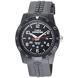- Water resistant to 50 metersA strong, bold look for an active man, the Timex Men's Expedition Rugged Analog Watch features a round, black dial with white, Arabic numeral indexes at even hours, 24-hour function indexes, luminous hands, and a date display at the three o'clock position. Even low-light conditions, the watch is easy to ready with its Indiglo night-light. A durable, black resin bezel and case surround the dial while a mineral crystal window protects from scratches and nicks. The strong watch band is also made from black resin and offers a buckle clasp that makes it easy to put on and take off. It's equipped with reliable quartz movement and is water-resistant to 165 feet (50 meters). Read more